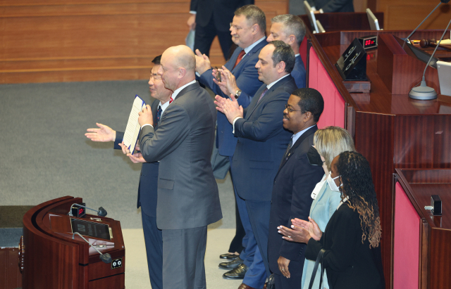 김진표 국회의장이 3일 국회에서 2030부산세계박람회의 성공적 유치 및 개최를 위한 결의안을 국제박람회기구(BIE) 실사단 파트릭 슈페히트 단장에게 전달하고 있다. 연합뉴스