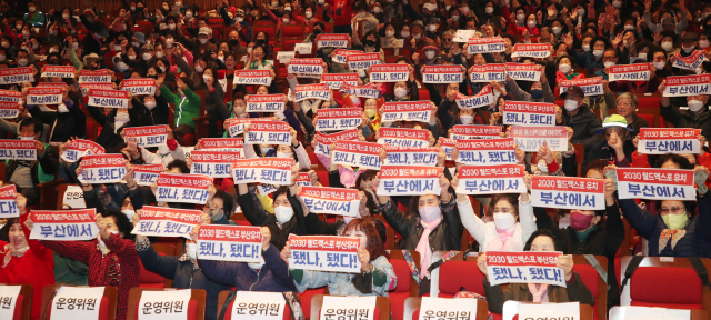 엑스포 부산 유치를 바라는 시민 열기가 뜨겁다. 지난달 25일 부산시민회관 대강당에서 열린 ‘2030월드엑스포 유치 기원 시민응원콘서트’에서 응원 구호를 외치는 시민들. 이재찬 기자 chan@