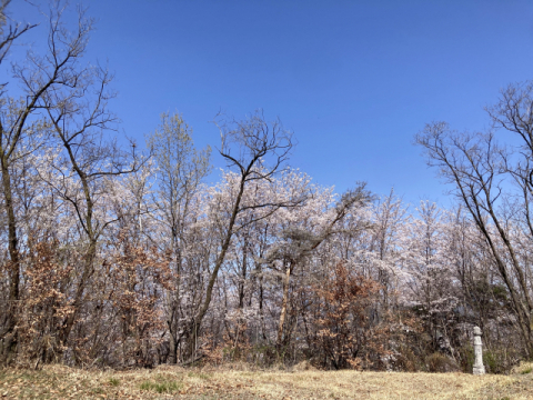 올해 봄꽃은 두서가 없다. 진달래가 피자 이어 산벚나무가 화려하게 자태를 뽐낸다. 유독 이곳 골짜기마다 흐드러진 능수벚꽃. 능수벚꽃의 전파자는 버찌를 탐낸 새들이겠지만, 운석공 일대가 수수한 연분홍 치장을 하는 데 일조했다. 이제 연둣빛 새싹의 향연이 함지박 가득 펼쳐지리라.