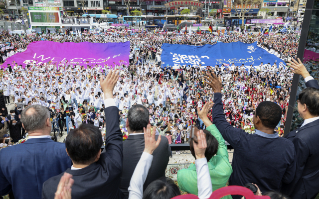 2030세계박람회 개최 후보지인 부산을 실사하기 위해 방한한 국제박람회기구(BIE) 실사단이 4일 오전 부산 동구 부산역에 도착한 뒤 환영공연을 감상하고 있다. 김종진 기자 kjj1761@