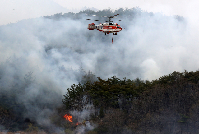 건조한 날씨가 이어지면서 홍성, 금산, 대전, 함평, 순천 등 전국적으로 동시다발적인 산불이 일어나고 있다. 4일 전남 함평군 대동면 연암리 대동저수지 인근 야산에서 산림청 소속 헬기가 진화 작업을 하고 있다. 연합뉴스
