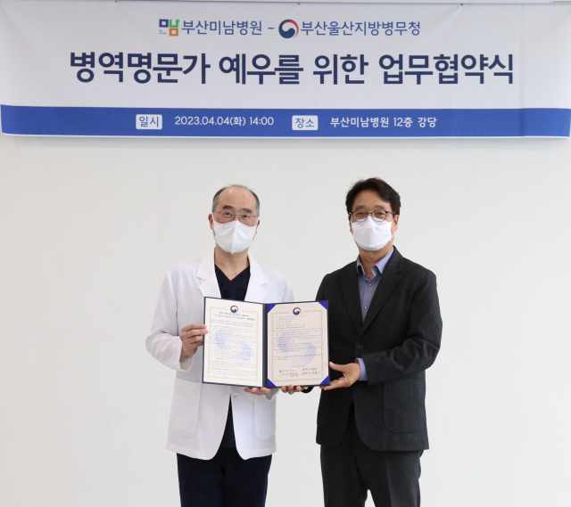 부산울산병무청(청장 최규석)은 4일 병역명문가, 병역판정검사 수검자 등 병역이행자의 의료할인 혜택을 위해 부산미남병원(대표원장 이춘기)과 업무협약을 체결했다.
