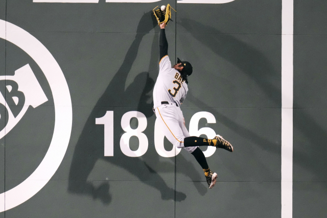 미국프로야구 피츠버그 파이리츠의 배지환이 5일(한국시간) 열린 보스턴 레드삭스 상대 원정 경기에서 8회 말 상대 공격수 데버스의 큼지막한 타구를 몸을 날려 낚아채고 있다. AP연합뉴스