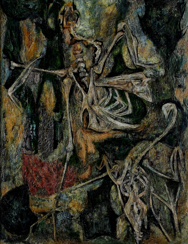 1958년에 제작된 작품 ‘태고’는 인간의 모습이 아닌, 메마르고 뒤틀린 형상의 인골을 보여준다. 한국 전쟁 이후 작가는 이처럼 인간의 형상이 사라진 인간의 모습, 건어물, 메마른 식물의 그로테스크한 형상을 주로 그렸다. 작가는 이것이 저항과 반발, 그리고 자포자기한 자신의 처지에 대한 은유라고 회고했다. 암울한 시대 상황에서 발발한 인간의 실존에 대한 물음이라는 주제와 거친 마티에르의 그로테스크한 표현 방식은 유럽 앵포르멜 회화의 영향을 받은 것으로 볼 수 있다. 김진아 부산시립미술관 학예연구사