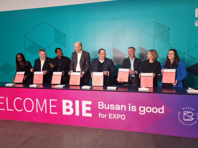 5일 K컬처 나이트 콘서트에 참석하기 위해 부산 해운대구 영화의전당을 방문한 국제박람회기구(BIE) 실사단이 핸드프린팅을 하고 있다. 김종진 기자 kjj1761@