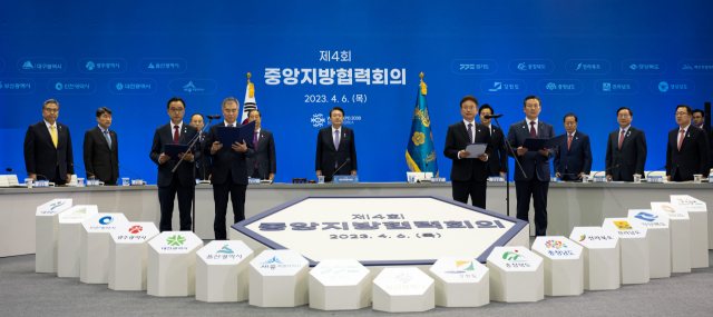 윤석열 대통령이 6일 부산 해운대구 벡스코에서 열린 제4회 중앙지방협력회의에서 최봉환(앞줄 왼쪽부터) 시군자치구의회의장협의회장, 김현기 시도의회의장협의회장, 이철우 시도지사협의회장, 조재구 시장군수구청장협의회장의 ‘2030세계박람회 부산 유치 성공을 위한 대한민국 지방 4대 협의체 공동결의문’ 낭독을 지켜보고 있다. 사진공동취재단