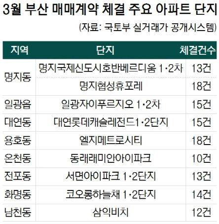이밖에 3월 부산 아파트 매매거래중 계약체결이 많았던 단지는 △남구 대연동 대연힐스테이트푸르지오 △남구 대연동 대연롯데캐슬레전드 1~2단지 △기장군 일광읍 일광자이푸르지오 1~2단지 △강서구 명지동 명지협성휴포레 등이었다.