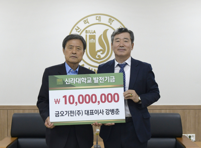 금오기전 강병춘 대표는 “우리 회사가 지금의 위치로 성장하고 발전하는 데 신라대 졸업생들을 비롯한 청년 인재들의 역할이 컸다”며 “이번 발전기금이 학교 발전과 인재 육성에 도움이 되길 바란다”고 말했다.