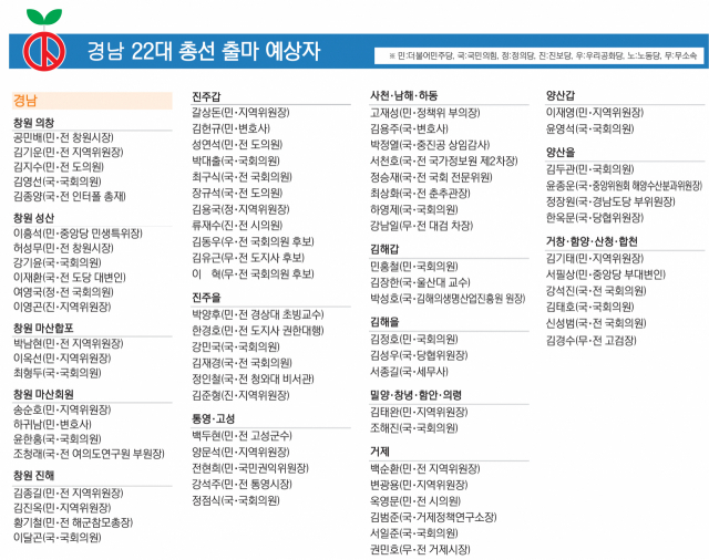 내년 총선에서 국민의힘은 경남 16석 전석을 확보하겠다는 각오다. 더불어민주당은 창원시 성산구를 포함한 창원시 3석과 김해시·양산시·거제시 등에서 8석을 가져오겠다는 목표를 세웠다. 경남의 최대 관심 대상은 5석이 걸린 창원시와 ‘낙동강 벨트’로 불리는 경남 동부다.