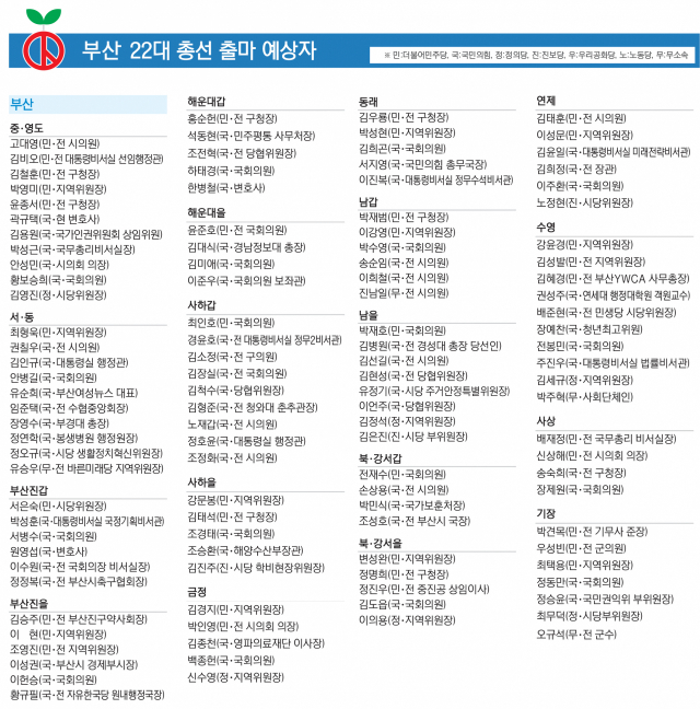 윤준호 전 국회의원(해운대을), 변성완 전 부산시장 대행(북강서을), 배재정 전 국무총리 비서실장(사상) 등 국회나 중앙 부처에서 몸집을 키운 인사도 민심 공략에 분주하다. 여기다 홍순헌 전 해운대구청장(해운대갑), 김태석 전 사하구청장(사하을), 서은숙 전 부산진구청장(부산진갑), 최형욱 전 동구청장(서동), 김철훈 전 영도구청장(중영도) 등 구청장 출신 정치인도 내년 총선에서 도전장을 내밀 것으로 예상된다.