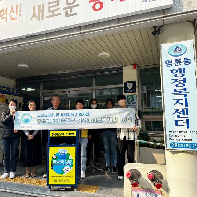 부산 동래종합사회복지관(관장 하소연)은 노인 일자리 창출과 ESG 실천을 위한 아이스팩 재활용사업 추진을 위해 동래구청(구청장 장준용)과 명륜·명장동 등에 전용 수거함을 설치했다.