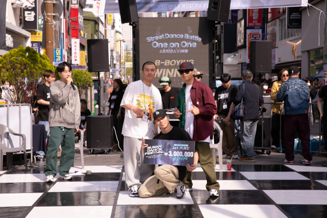 1일 차 비보잉 배틀 우승자 '밤(BAM·노희범·가운데)'과 심사위원. 부산시 제공