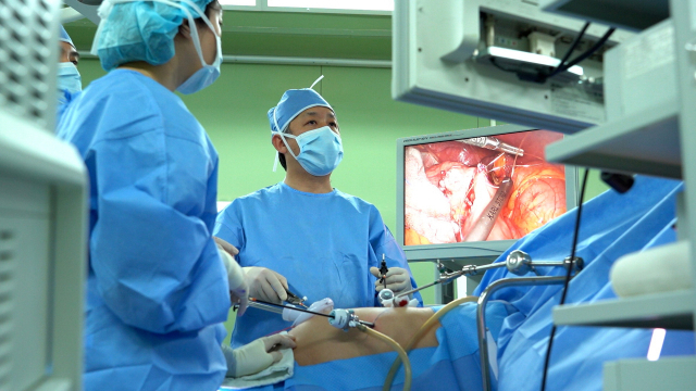 복강경을 이용해 위암 수술을 하고 있는 동아대병원 외과 김민찬 교수. 부산일보DB