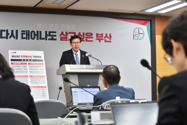 박형준 부산시장이 10일 부산시청에서 열린 2023년도 추경예산안 브리핑에서 예산안 관련 설명을 하고 있다. 부산시 제공