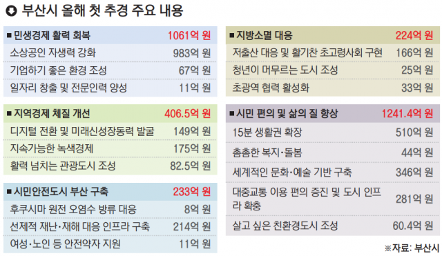 시는 전체적으로 민생경제 활력 회복과 시민 안전도시 부산 구현에 초점을 맞춰 많은 예산을 배정했다. 또 시민 일상에 눈높이를 맞춰 저출생과 지방소멸에 대응하는 사업, 삶의 질 향상 등 박형준 부산시장이 약속한 ‘다시 태어나도 살고 싶은 도시 부산’을 구현하는 사업에도 상당한 예산을 안배했다.