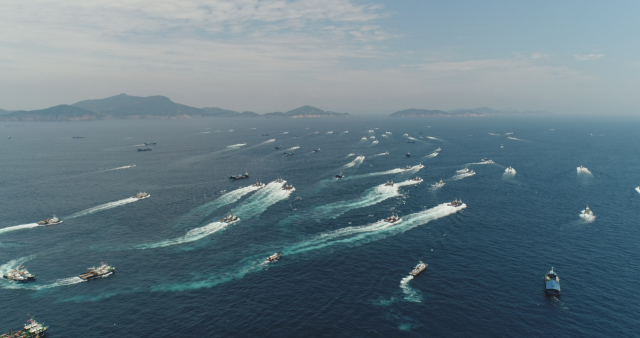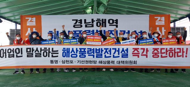 대규모 해상풍력단지 건설로 사라질 위기에 처한 황금어장을 지키려 집단행동에 나섰던 어민들. 통영‧삼천포‧멸치권현망 3개 해상풍력대책위원회는 2021년 11월 통영 욕지도 앞바다에서 정부의 무분별한 해상풍력발전 추진을 규탄하는 해상시위를 벌였다. 부산일보DB