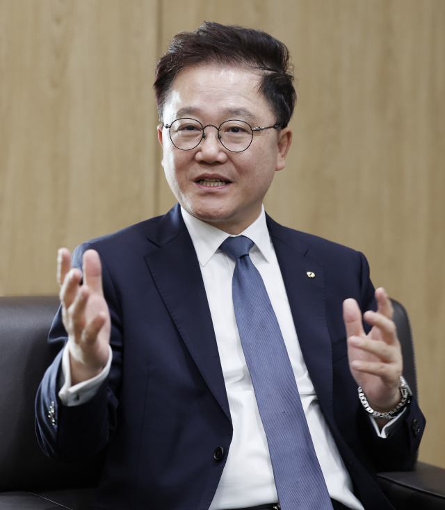 강석훈 KDB산업은행 회장은 11일 <부산일보>와의 인터뷰에서 산업은행 본점 부산 이전을 통해 동남권을 대한민국 경제의 새로운 성장축으로 육성하는 데 기여하겠다고 강조했다. 정대현 기자 jhyun@