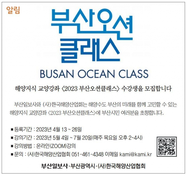 부산일보사와 (사)한국해양산업회는 해양수도 부산의 미래를 함께 고민할 수 있는 해양지식 교양강좌 〈2023 부산오션클래스〉에 부산시민 여러분을 초청합니다.