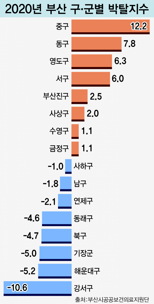 예외적으로 강서구와 기장군은 감소하는 추세다. 신도시 조성으로 신규 아파트가 늘고 신혼부부 등 젊은 층이 유입된 요인이 작용한 것으로 분석된다. 반면 인구 유출과 고령화가 심한 중·동·서·영도구는 2005년부터 전국 대비 박탈지수가 높은 구에 빠짐없이 이름을 올리는 등 원도심 쇠퇴 현상을 여실히 드러낸다.