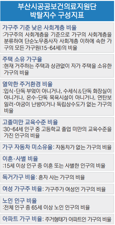 부산시공공보건의료지원단은 10가지 구성지표를 분석해 박탈지수를 산출한다. △가구주 기준 낮은 사회계층 비율 △주택 소유 가구율 △열악한 주거환경 비율 △고졸 미만 교육수준 비율 △가구 자동차 미소유율 △이혼·사별 비율 △독거가구 비율 △여성 가구주 비율 △노인 인구 비율 △아파트 가구 비율이다. 통계청 ‘인구주택총조사’ 자료를 토대로 분석 프로그램을 동원해 구성지표를 산출하며, 지역별 표준화 점수를 합산해 전국 구·군별 박탈지수를 산출한다.