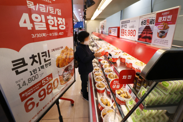 교촌치킨이 이달부터 치킨 가격을 최대 3000원 인상하자 관련업계가 들썩인다. 이달 초 롯데마트에서 선보인 반값 치킨 판매 모습. 연합뉴스