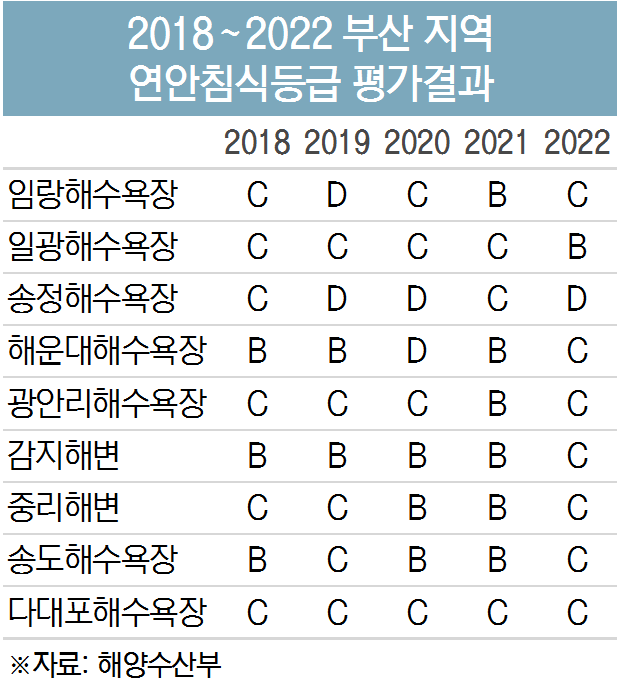 지난해 연안 침식 실태조사에서 D등급을 받은 해운대구 송정해수욕장은 해양수산부의 제3차 연안정비기본계획 대상지로 선정됐다. 송정해수욕장의 경우 2029년까지 총사업비 298억 원을 들여 모래 30만㎥를 투입하고 모래 유실을 막기 위한 구조물인 돌제를 설치하는 등 정비를 진행할 예정이지만 정확한 사업 시행 시기는 정해지지 않았다. 해수부 관계자는 “각 지자체에서 연안정비사업을 추진해 달라고 요구하지만 예산 문제로 한계가 있다 보니 침식 정도에 따라 연안정비사업 순서를 결정한다”고 말했다.