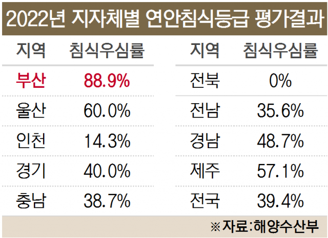 전국적으로 보면 해수욕장 218곳 중 C등급 71곳, D등급 15곳이었다. 부산은 전국 평균(39.4%)보다 배 이상 침식 위험이 높았다. 울산의 경우 60%, 경남은 48.7%의 침식우심률을 보였다. 가장 좋은 평가를 받은 전북의 경우 해수욕장 11곳 중 A등급 1곳, B등급 10곳이어서 침식우식률 0%를 기록했다.