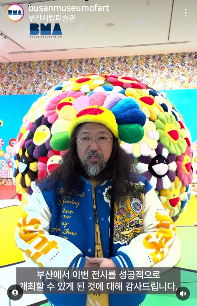 무라카미 다카시 작가는 이날 부산 전시에 대한 감사 인사를 전하는 영상을 찍었고, 부산시립미술관은 전시 마지막 날인 16일 이 영상을 미술관 공식 인스타그램에 올렸다.