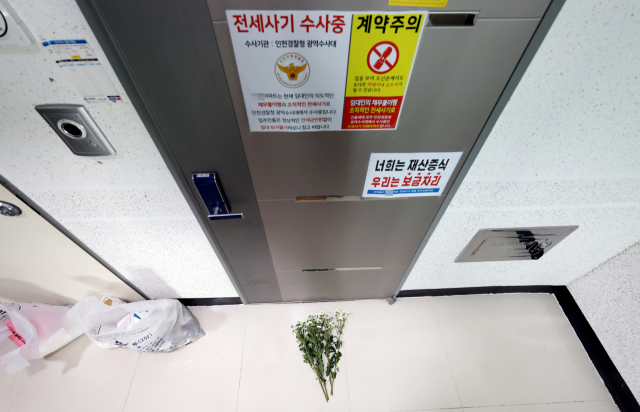 17일 오전 전세사기 피해 사망자 A씨가 거주한 인천시 미추홀구 한 아파트 현관문 앞에 추모 조화가 놓여 있다. 연합뉴스