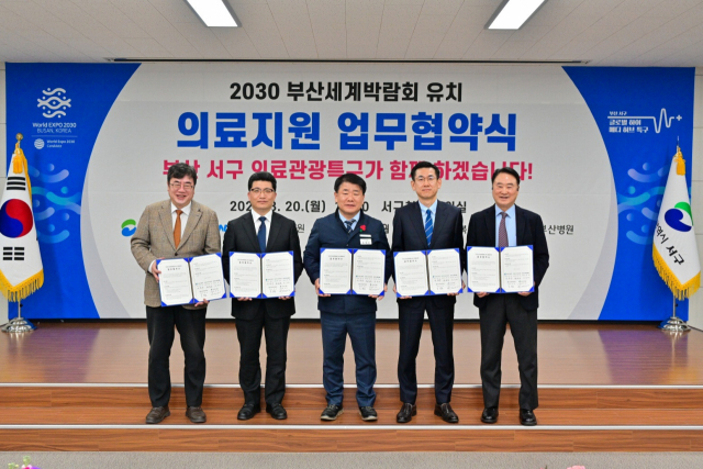 지난 3월 20일 오후 서구청 대회의실에서 공한수 구청장, 정성운 부산대병원장, 안희배 동아대병원장, 오경승 고신대복음병원장, 최명섭 삼육부산병원장이 참석한 가운데 ‘엑스포 유치를 위한 의료지원 업무협약식’을 개최했다. 대규모 국제행사를 안전하게 치르기 위해선 전문적인 의료 지원이 필요하기 때문에 서구가 엑스포 유치를 지지하고 힘을 보태기 위한 자리였다. 4개 의료기관장들은 엑스포 개최국 발표 때까지 의료관광특구 사업을 활용한 의료 지원, 엑스포 유치를 위한 홍보사업 공동 추진 등 엑스포의 성공적인 유치를 위해 상호 협력하기로 했다.