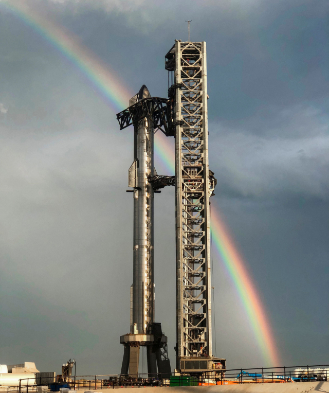 우주기업 스페이스X가 개발한 대형 우주선 ‘스타십’이 17일(현지시간) 미국 텍사스주 남부 보카 치카 해변의 ‘스타베이스’에서 발사를 위해 대기하고 있다. AFP연합뉴스
