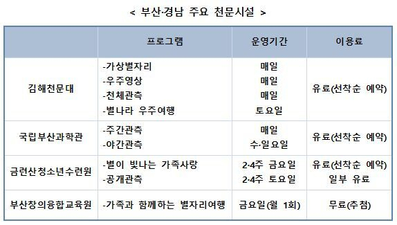 부산시교육청 산하 창의융합교육원도 이달 말부터 월 1회 ‘가족과 함께하는 별자리여행’ 프로그램을 진행한다. 천체투영실 관람, 천체 공작, 천문이론 수업에 이어 천체망원경으로 계절별 별자리와 달을 관찰해 볼 수 있다.