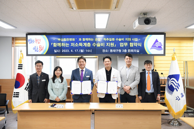 부산 동래구(구청장 장준용)와 관절·척추 질환 전문병원인 부산힘찬병원(병원장 김태균)은 지역 내 저소득층의 건강한 삶을 위해 지난 17일 동래구청 중회의실에서 ‘함께하는 저소득계층 수술비 지원 협약식’을 맺었다.