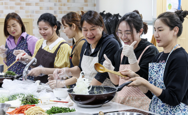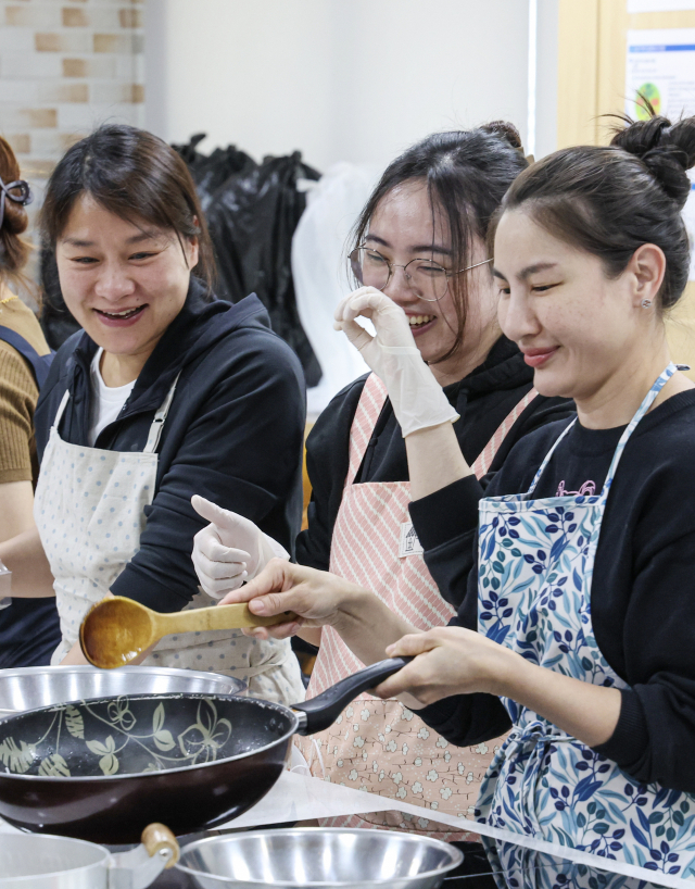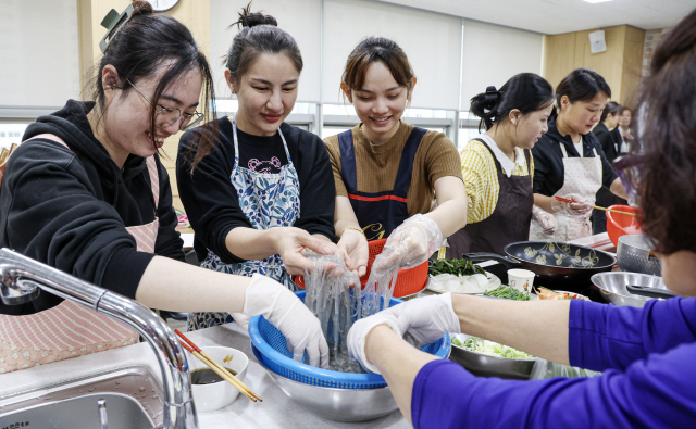 18일 오전 부산진구청 평생학습관 조리실에서 부산진구여성단체협의회가 주최하는 다문화가족 1일 요리체험교실에 참가자들이 한국요리를 만들며 즐거운 시간을 보내고 있다.