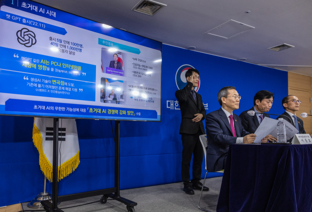 이종호 과학기술정보통신부 장관(왼쪽), 고진 대통령 직속 디지털플랫폼위원회 위원장(가운데)과, 고학수 개인정보보위원회 위원장이 14일 서울 정부서울청사 기자회견장에서 디지털플랫폼 정부 실현 계획 보고회에 브리핑을 하고 있다. 연합뉴스