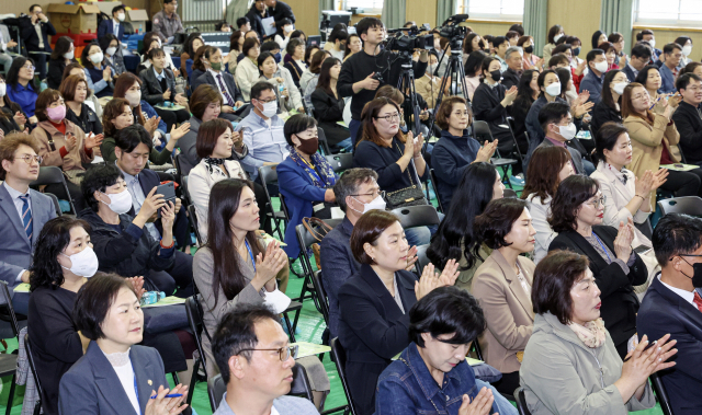 지역 간 교육격차 해소를 위한 토론회가 18일 부산 사상구 학장초등학교 강당에서 열렸다. 현장 참석자들이 토론자의 발언을 경청하고 있다. 김종진 기자 kjj1761@