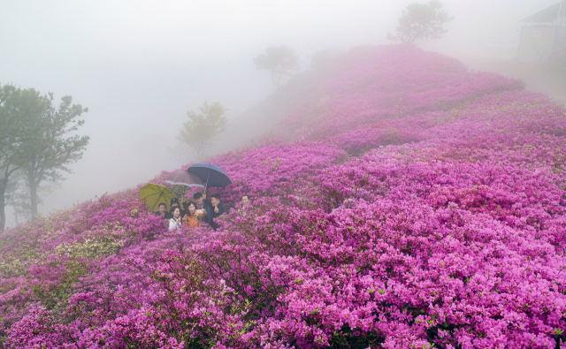 부산 최대의 철쭉 군락지인 부산 부산진구 백양산 애진봉 능선에 19일 짙은 안개에도 진분홍 철쭉꽃이 만발해 장관을 이루고 있다.
