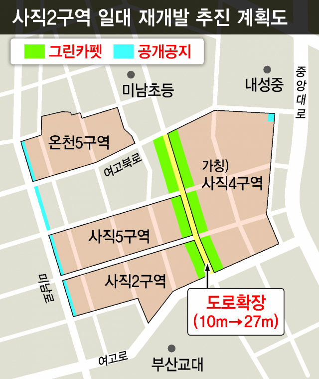 부산시는 19일 “사직2구역 재개발사업이 도시경관공동심의위원회 심의를 통과해 정비계획 결정과 정비구역 지정이 완료됐다”고 밝혔다. 사직2구역 정비계획에는 재개발지역과 인접한 도로인 여고로 폭을 기존 10m에서 27m로 확장하고, 폭 30m 그린카펫(단지와 단지 사이에 있는 녹지공간)을 조성하는 내용이 담겼다. 또 미남로변 공개공지 조성 등을 통한 개방형 단지 설계 내용 등이 포함됐다.
