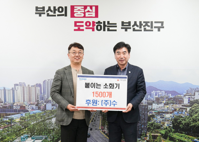 ㈜수(대표 황득규)는 지난 18일 지역 내 어려운 이웃을 위해 붙이는 소화기(119 스티커 콘센트용) 1500개를 부산 부산진구청(구청장 김영욱)에 기탁했다.