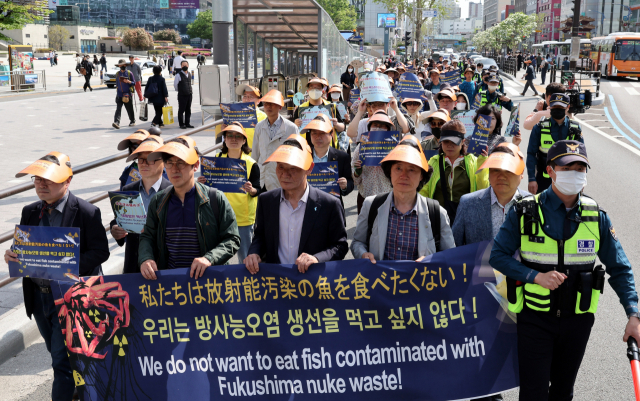 또 “대한민국 소비자가 방사능으로부터 안전하게 수산물을 섭취할 권리를 보장하라”며 동구 초량동 정발장군 동상 앞까지 거리행진을 이어갔다.