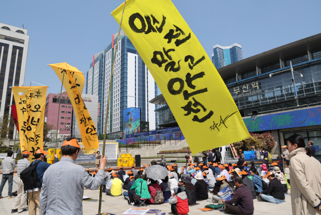 20일 오후 부산역 광장에서 열린 ‘후쿠시마 오염수 투기 결사저지, 방사능 없는 지구의날 선포 시민대회’에서 참가자들이 일본정부의 후쿠시마오염수 방류 계획 철회를 요구하고 있다. 정종회 기자 jjh@