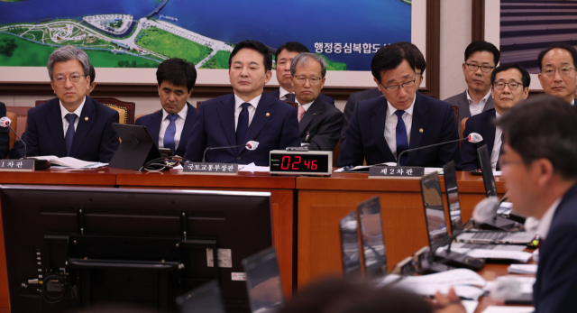 원희룡 국토교통부 장관(가운데)와 이원재 1차관(왼쪽), 어명소 2차관이 20일 오전 서울 여의도 국회에서 열린 국토교통위원회 전체회의에 참석해 있다. 연합뉴스