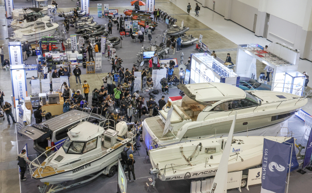 23일 부산 해운대구 벡스코에서 열린 ‘2023 부산국제보트쇼’에서 관람객들이 다양한 요트와 보트 등을 둘러보고 있다. 이번 행사에는 107개 사가 참가했다.
