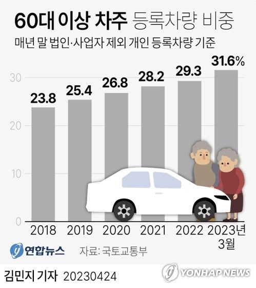 매년 12월 말 기준으로 60대 이상 차주의 등록차량 비중은 △2018년 23.83%에서 △2019년 25.40% △2020년 26.78% △2021년 28.15% △지난해 29.29%로 계속 상승하다 올들어 30%를 넘어선 것.