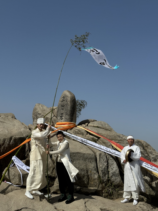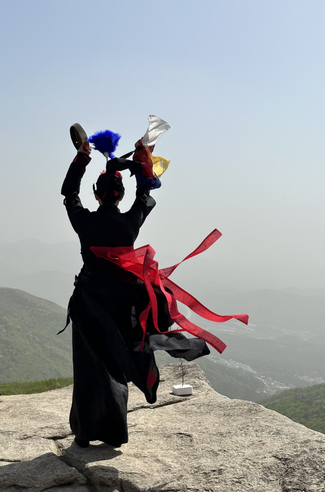 2023 금정산생명천지굿이 열린 고당봉에서 강미리(가운데) 부산대 교수. 김은영 선임기자