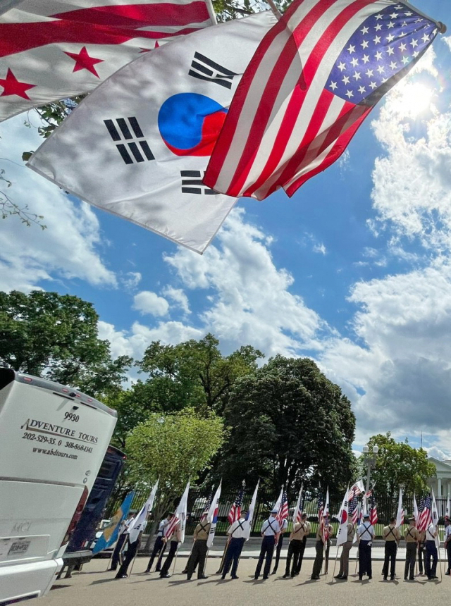 윤석열 대통령의 국빈 방문을 하루 앞둔 23일(현지 시간) 미국 워싱턴DC 백악관 앞에서 미군 의장대가 태극기와 성조기를 들고 도열하고 있다. 연합뉴스