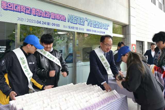 동의대학교(총장 한수환)는 지난 24일 1학기 중간시험 기간을 맞아 아침 일찍 도서관을 찾은 학생을 격려하기 위해 중앙도서관 입구에서 샌드위치와 커피 350세트를 제공했다.