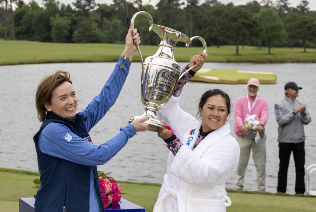 24일(한국시간) 끝난 시즌 첫 메이저 대회 셰브런 챔피언십에서 우승한 릴리아 부가 우승컵을 치켜들고 있다. 부는 대회 명칭과 장소가 바뀌기 전 우승자가 연못에 뛰어든 전통을 이어 이번 대회에서도 입수 세리머니를 펼쳤다. USA TODAY Sports연합뉴