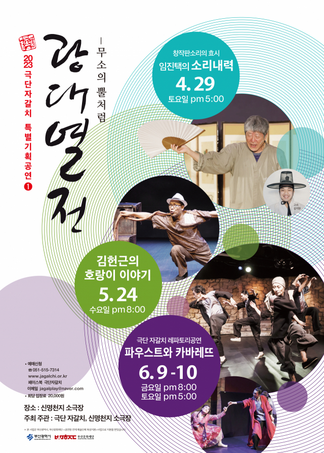 극단 자갈치는 올해 특별기획공연 ‘광대열전-무소의 뿔처럼’을 부산 금정구 부곡동 신명천지소극장 무대에 올린다. 이달 29일 창작 판소리 선구자인 임진택 ‘소리내력’, 다음 달 24일 배우 1인 공연 ‘김헌근의 호랑이 이야기’, 6월 9~10일 극단 자갈치 ‘파우스트와 카바레뜨’를 연이어 선보인다.
