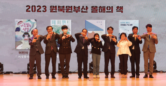 25일 오후 부산학생교육문화회관 대강당에서 열린 ‘2023 원북원부산 어울림한마당’ 행사에서 내빈들이 원북원부산 올해의 책 선포 퍼포먼스를 하고 있다.